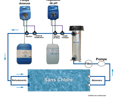 La pompe de filtration fait circuler l'eau de la piscine dans le système UV ou cette eau est stérilisée, par la suite, et selon les cas, il est possible d'ajouter des produits de traitement et d'équilibre de l'eau.